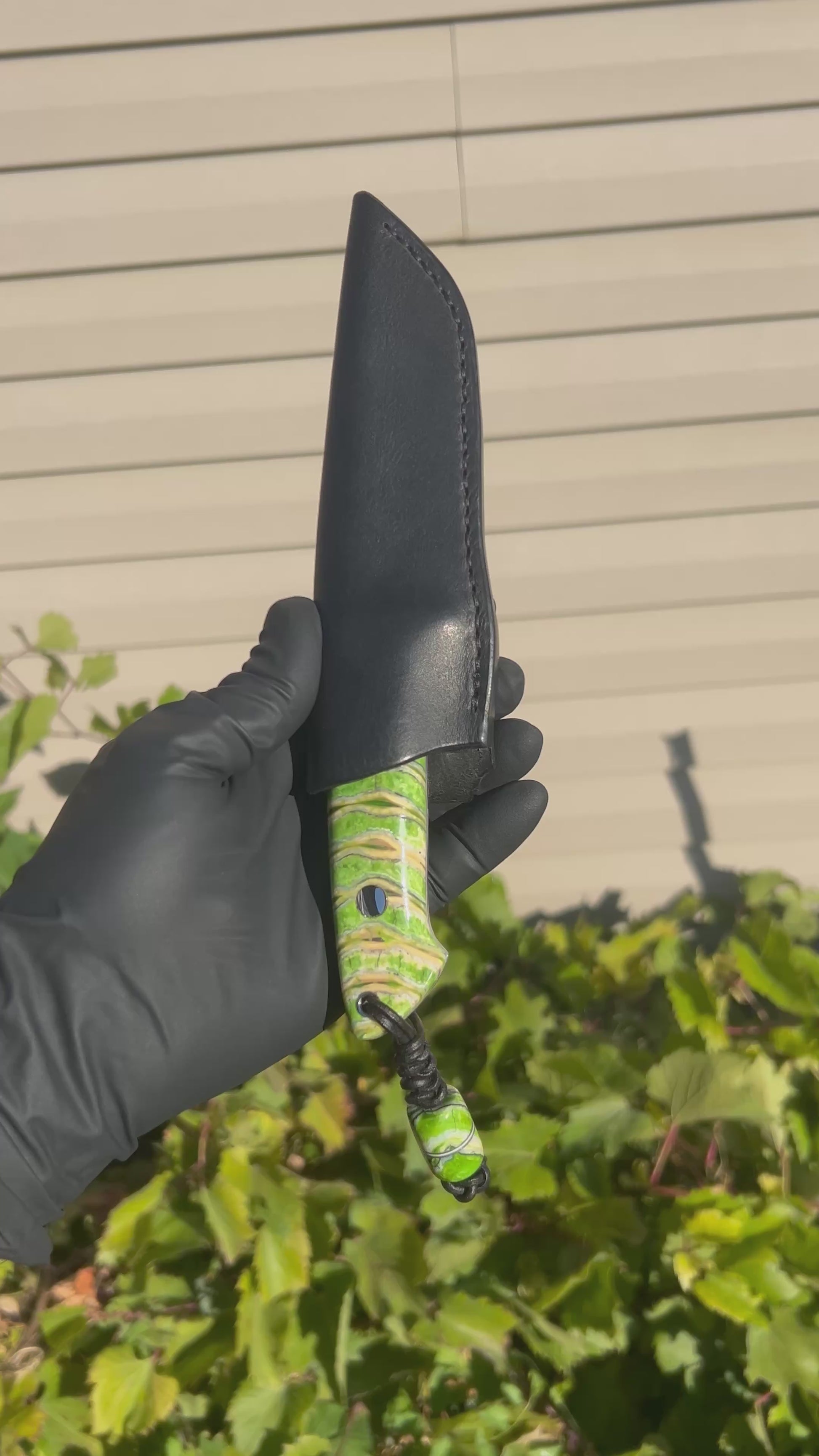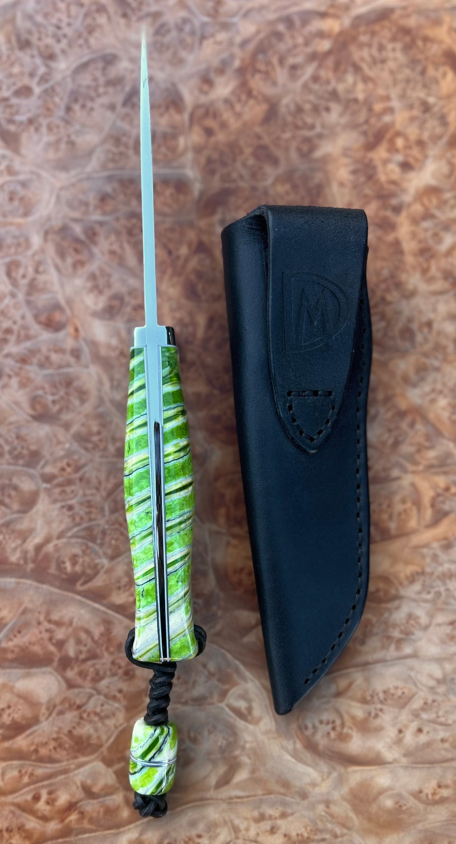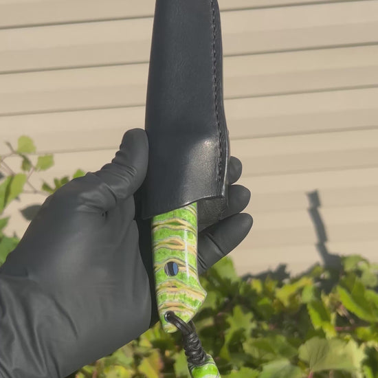Drop point hunter in dyed and stabilized wooly mammoth molar. Blade steel is mirror finished AEB-L stainless at 61 HRC with 416 stainless guard and hardware. The guard is pinned and silver soldered into place for a secure and seamless fit up. Includes a matching removable bead lanyard and custom fitted black leather sheath. This is a quality hand crafted heirloom made to last generations.