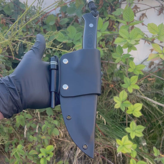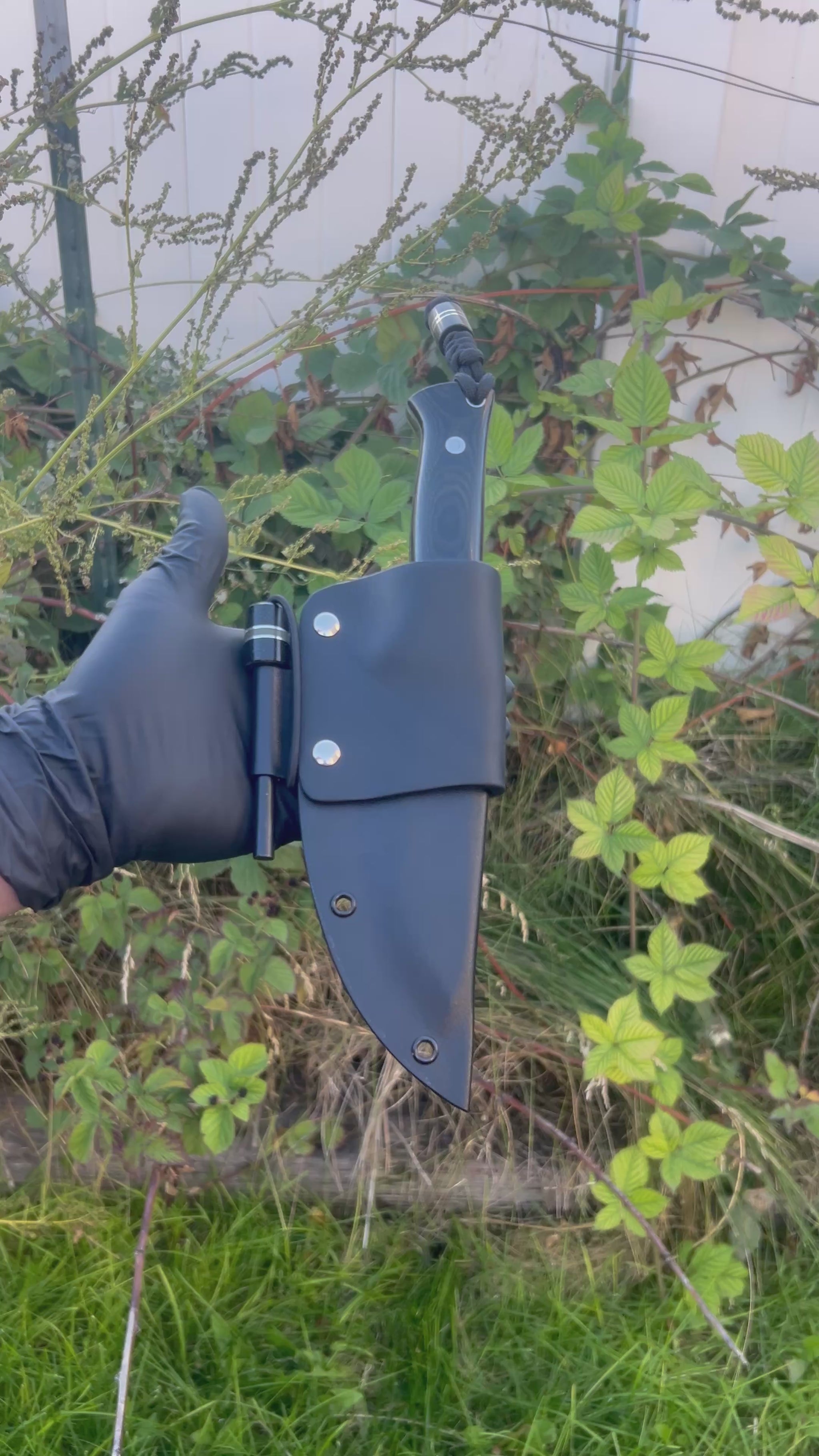 D.Mello Knives Endure Bushcrafter in black canvas micarta and jade G10 liners with matching lanyard and ferro fire starter. Blade steel is 7/32 thick A2 steel at 61 HRC with a 3/8 convex scandi grind with a black oxide stonewashed finish. The sheath is kydex with a premium leather overwrap and holds the knife and ferro rod securely.Ferro rods when worn out can be sent in for service to have a new rod installed. This is a hard use outdoor bushcraft knife built to last generations!
