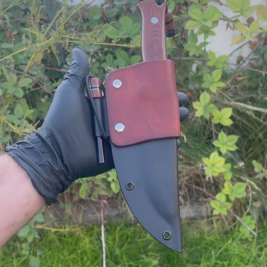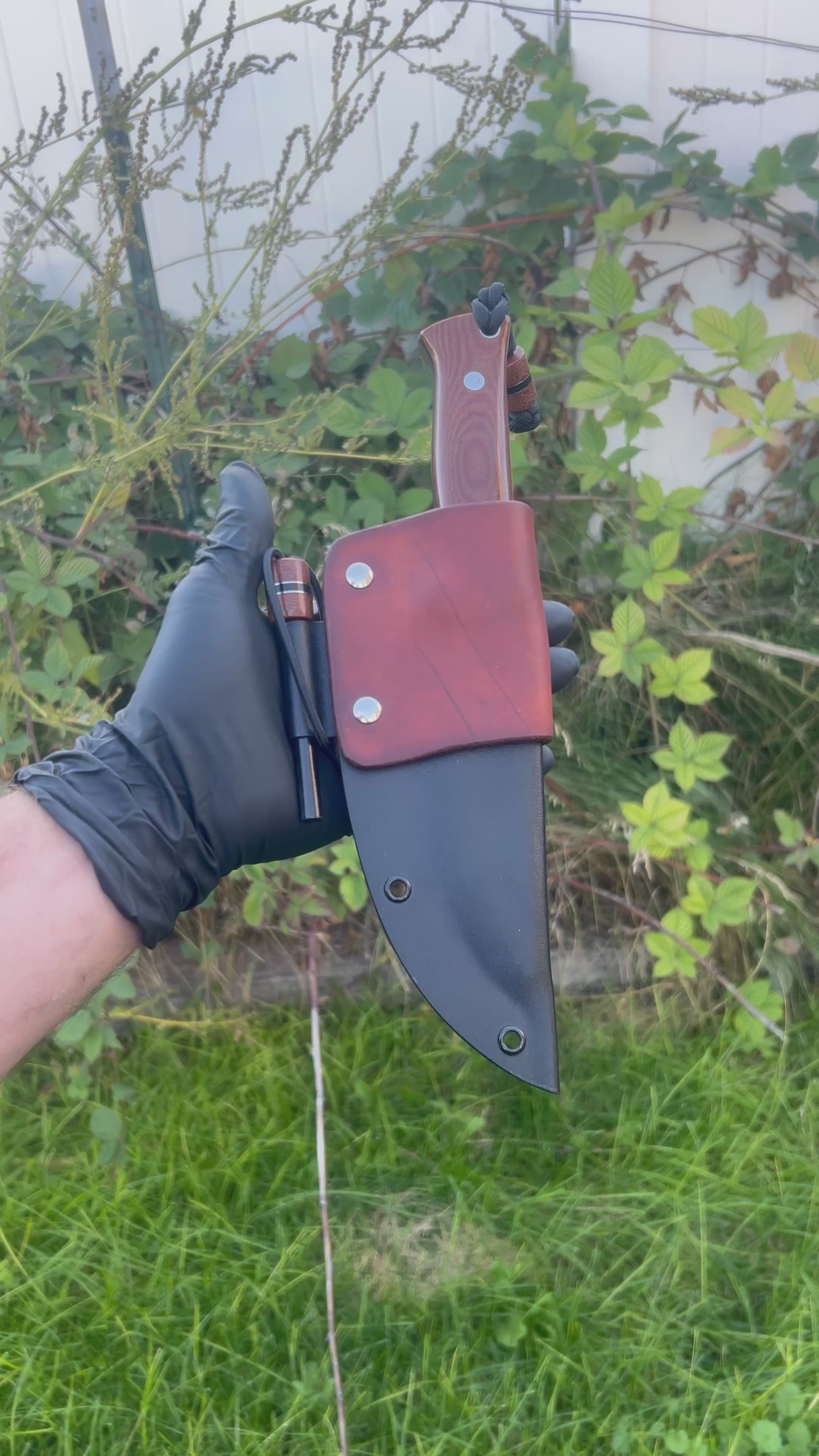 D. Mello Knives Endure Bushcrafter in natural canvas micarta with black G10 and liners with matching lanyard and ferro fire starter. Blade steel is 7/32 thick A2 steel at 61 HRC with a 3/8 convex scandi grind with a black oxide stonewashed finish. The sheath is kydex with a premium leather overwrap and holds the knife and ferro rod securely.