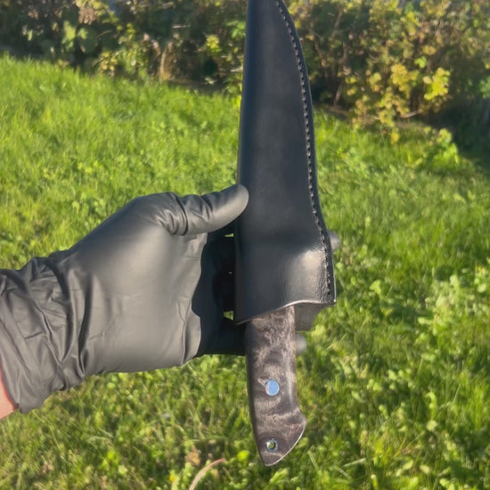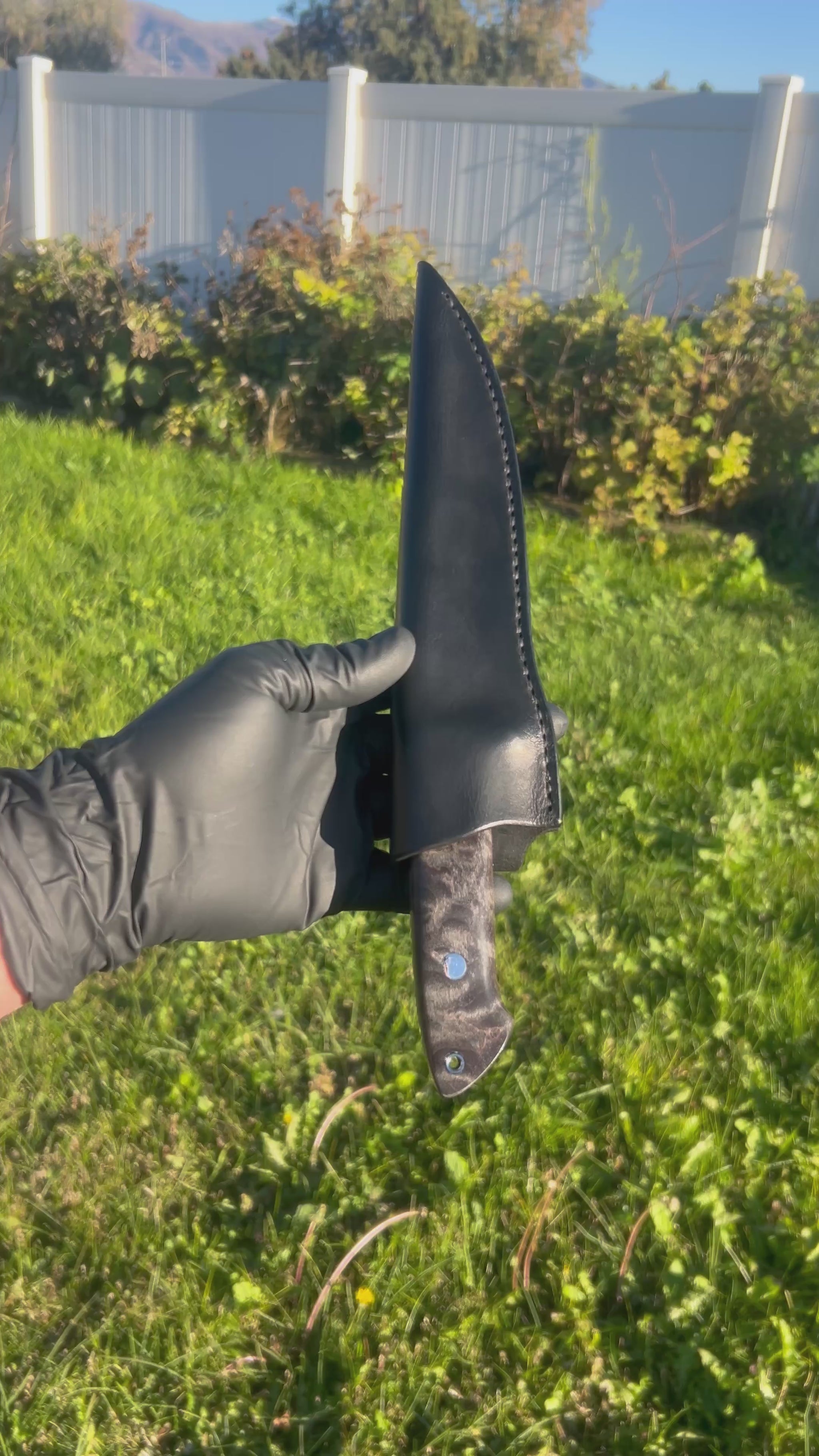 This Western Fighter Bowie is hand crafted from mirror finished CPM 154 stainless steel at 61 HRC. It has a 416 stainless guard and hardware. The guard is pinned and silver soldered into place for a secure and seamless fit up. The handle scales are dyed and stabilized quilted maple with thin red liners. Includes a custom, form fitted, hand saddle stitched black leather sheath.